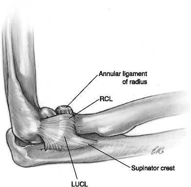 Figure 6-12 The lateral elbow ligaments. LUCL, lateral ulnar collateral ligament; RCL, radial collateral ligament.