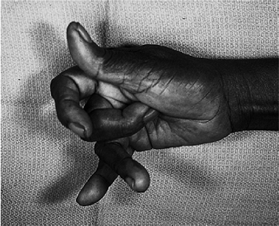 Figure 6-2 The clinical appearance of a typical “locked” trigger finger. Note that flexion is present in the MCP, PIP, and DIP joints. -