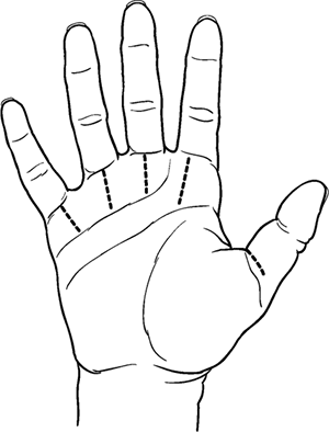 The proximal part of the incision over the middle finger is angled slightly, to parallel the distal palmar flexion crease.