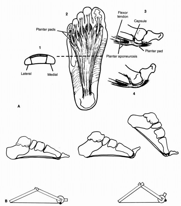Plantar aponeurosis. (1) Cross-section. (2) Division of plantar aponeurosis around flexor tendons. (3) Components of the plantar pad and its insertion into the base of the proximal phalanx. (4) Toe in extension with the plantar pad drawn over the metatarsal head. (B) The windlass mechanism functions by the passive dorsiflexion of the metatarsophalangeal joints in the last half of the stance phase, which tightens the plantar aponeurosis and mechanically causes the longitudinal arch to rise. This is probably the main stabilizer of the longitudinal arch of the foot. (A from Mann R, Inman VT. Structure and function. In: Du Vries HL. Surgery of the Foot, 2nd Ed. St Louis: CV Mosby, 1965) |