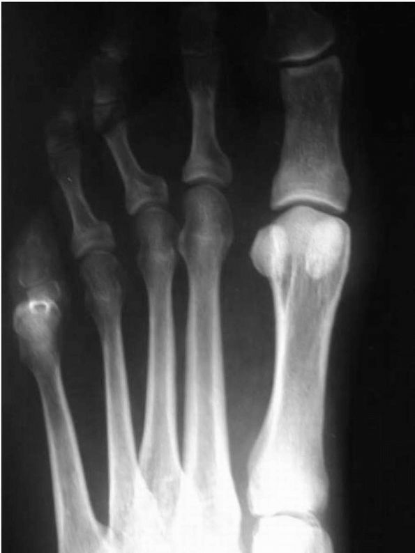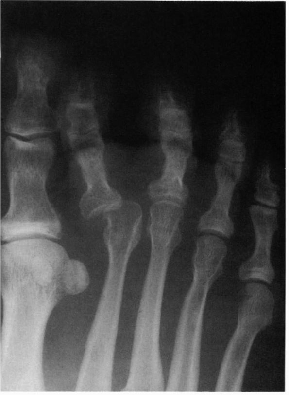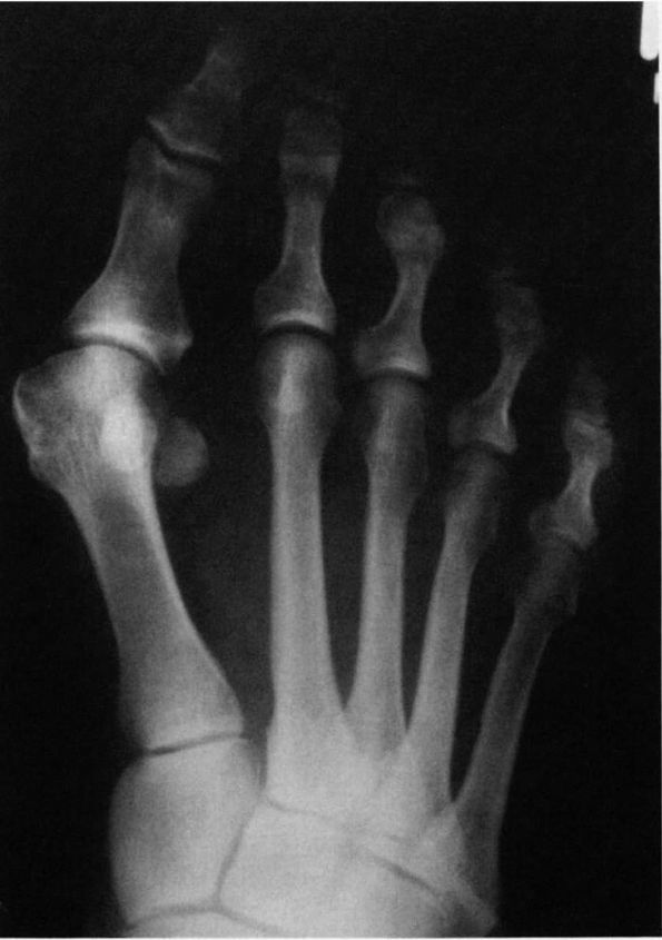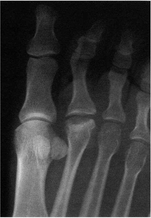 Radiograph of a hallux valgus deformity. Note the lateral deviation of the proximal phalanx on the metatarsal head, the medial deviation of the metatarsal head, and subluxation of the sesamoids. |