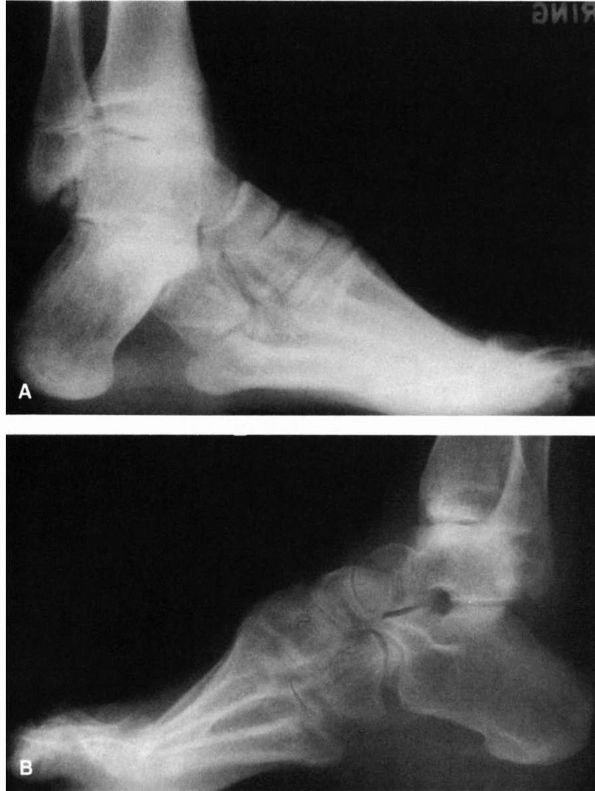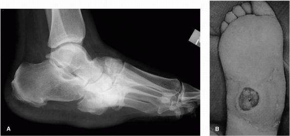 Lateral radiograph demonstrating severe midfoot fracture subluxation with midfoot collapse consistent with rocker-bottom deformity. (B) Clinical consequence of ulceration secondary to plantar bony prominence associated with collapse. |