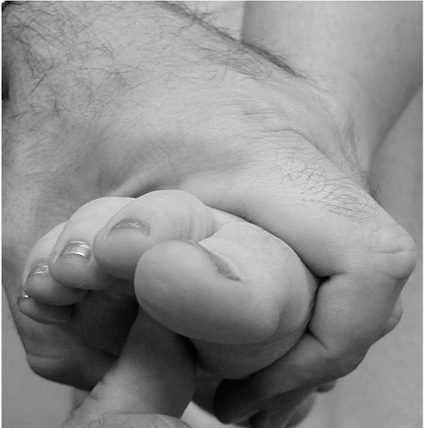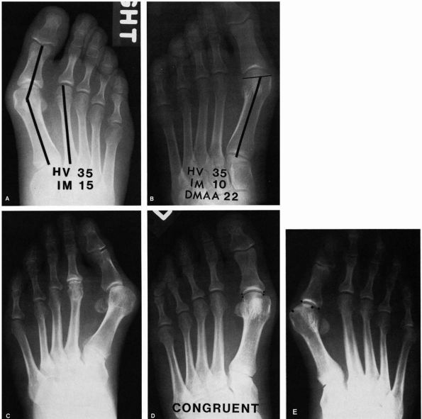 A congruent joint is one in which there is no lateral subluxation of the proximal phalanx on the articular surface of the metatarsal head. (E) The incongruent or subluxated joint has lateral deviation of the proximal phalanx on the metatarsal head. |