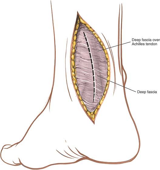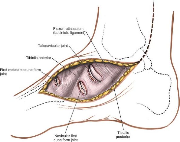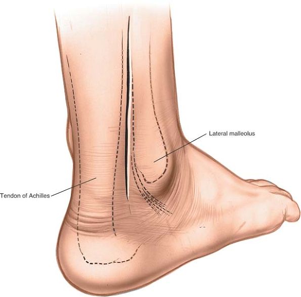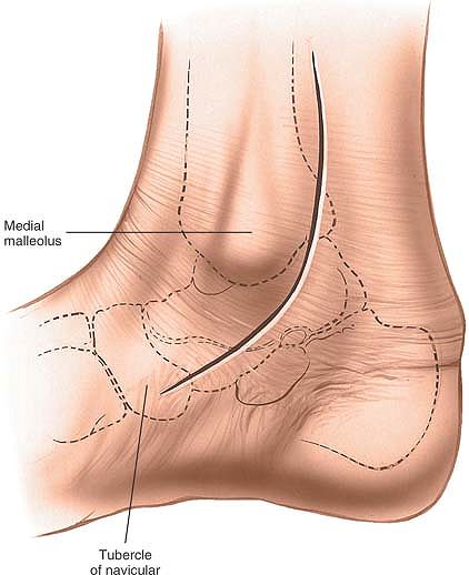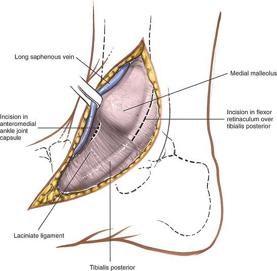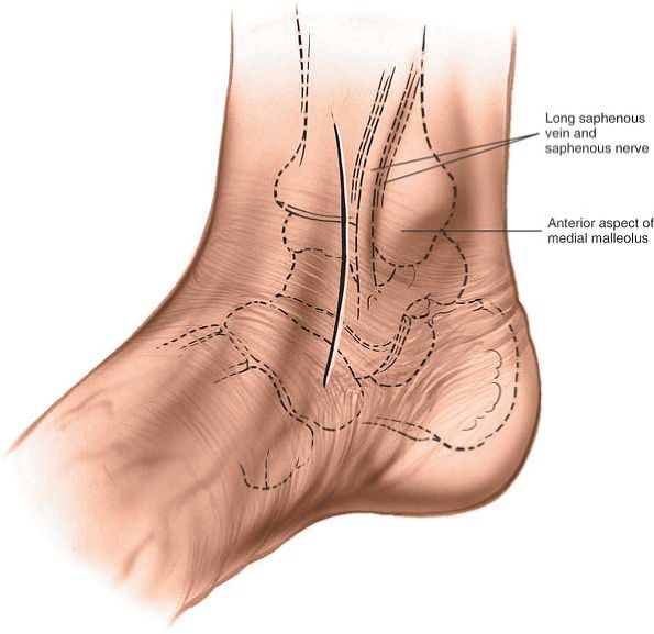 of the skin incision (Fig. 12-2A). Alternatively, make a 15-cm longitudinal incision with its center overlying the anterior aspect of the medial malleolus (see Fig. 12-2).