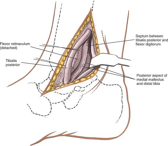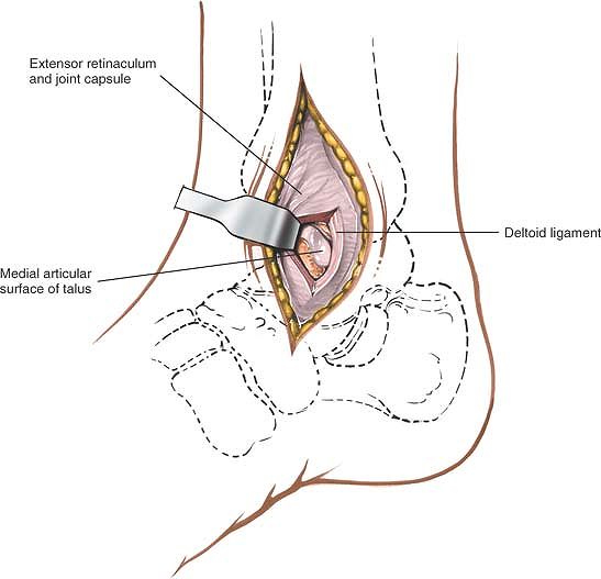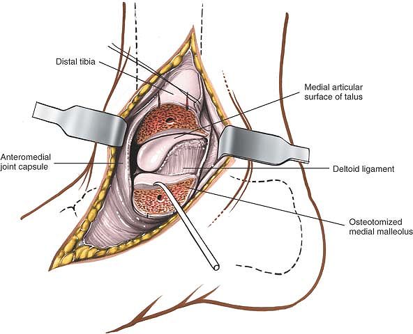 most provide access to both areas. The anterior approach to the ankle is used for arthrodesis; it offers excellent exposure of the anterior compartment of the ankle joint. The approach to the medial malleolus is a commonly used incision, providing access to the distal tibia in cases of fracture. A more extensive approach to the medial side of the ankle joint also exposes the distal tibia, but involves an osteotomy. The posteromedial approach to the ankle
