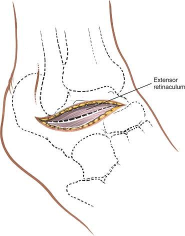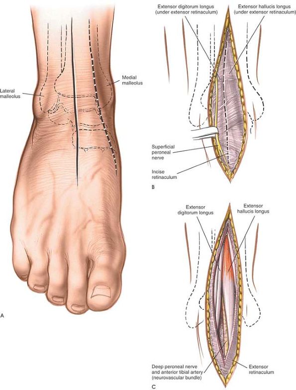 Figure 12-2 (A) Make a longitudinal incision over the anterior aspect of the ankle joint. (B) Identify and protect the superficial peroneal nerve. Incise the extensor retinaculum in line with the skin incision. (C)