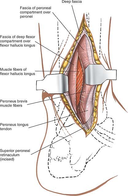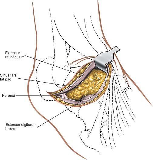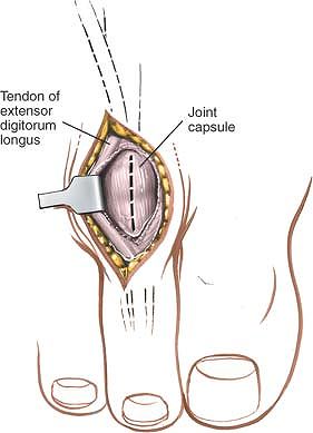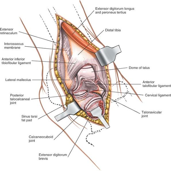 behind the tendon of the extensor hallucis longus. Retract the tendon