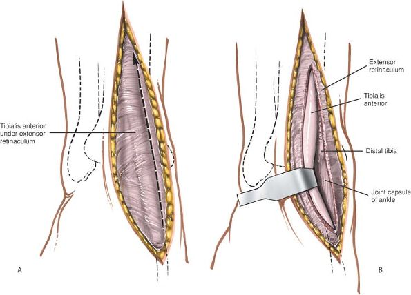 Figure 12-4 (A) Alternately, incise the extensor retinaculum on the medial side of the tibialis anterior tendon. (B) Retract the tibialis anterior laterally to expose the anterior surface of the ankle joint.