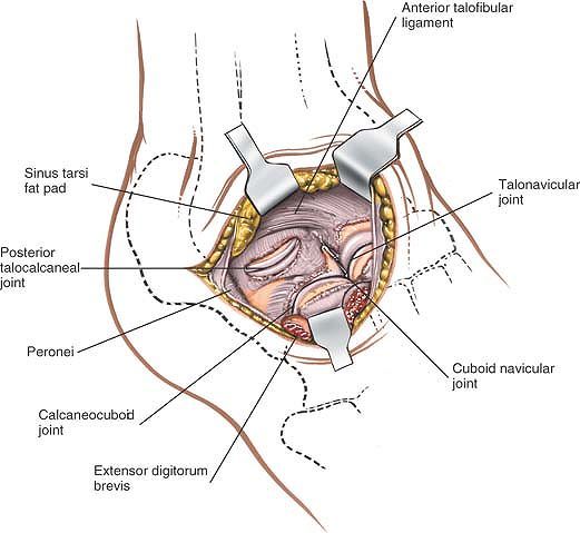 The posterolateral approach to the ankle joint provides limited access to the back of the joint and the posterior facet of the subtalar joint. The lateral approach to the ankle and hindpart of the foot exposes the ankle and the joints of the hindfoot. The lateral approach to the hindpart of the foot and the posterolateral approach to the talocalcaneal joint