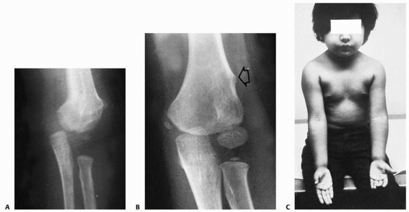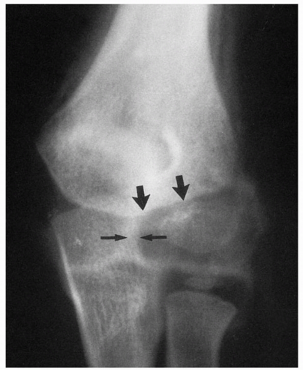 around 6 years.59,73,83,98,142 Fractures concerning the medial condylar physis are rare and occur most often in children 8 to 12 years of age.59,83,98 Fractures