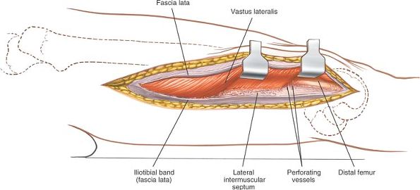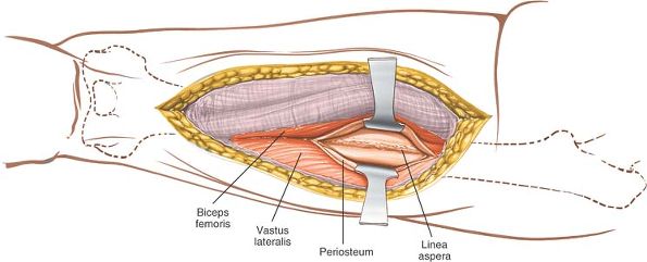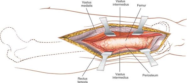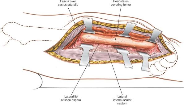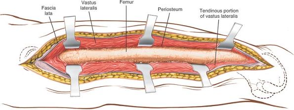 Split the fibers of the vastus lateralis. To develop a subperiosteal plane, squeeze two Homan retractors down to the femoral shaft and separate them to split the vastus lateralis further. |