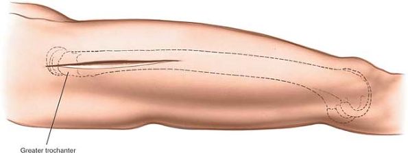 Figure 9-2 Incision for the lateral approach to the proximal femur.