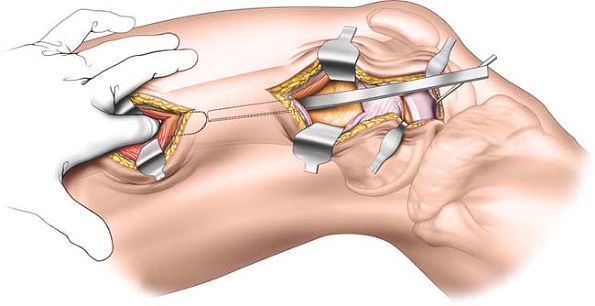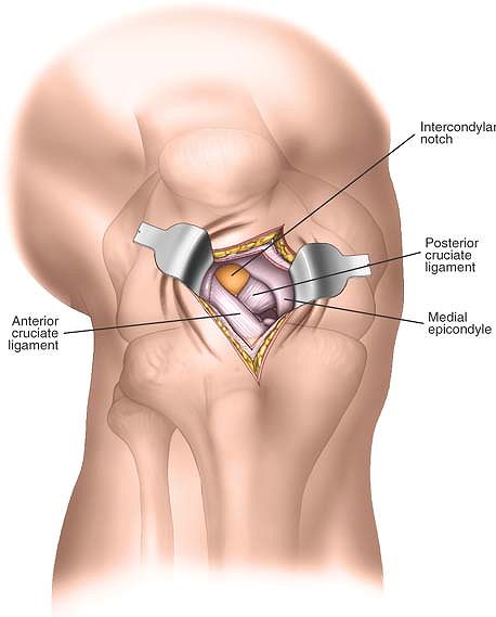 Divide the underlying synovium of the knee. Insert two retractors to visualize the intercondylar notch and the insertion of the posterior cruciate ligament onto the lateral aspect of the medial femoral condyle. |