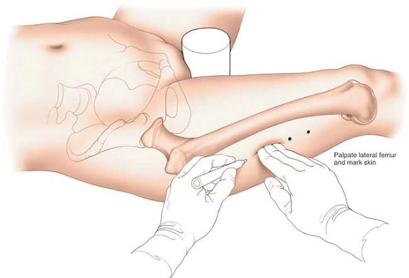 Landmark technique. Draw a line perpendicularly downwards from the anterior superior iliac spine. Where this line crosses the previously drawn line on the lateral aspect of the thigh, mark the skin. |