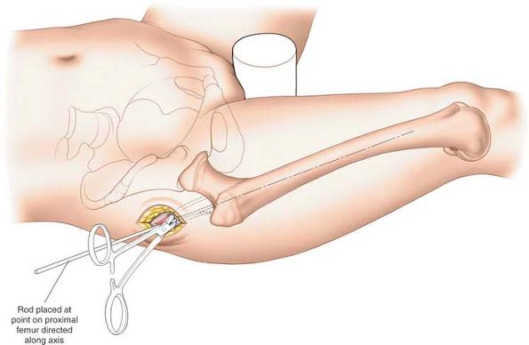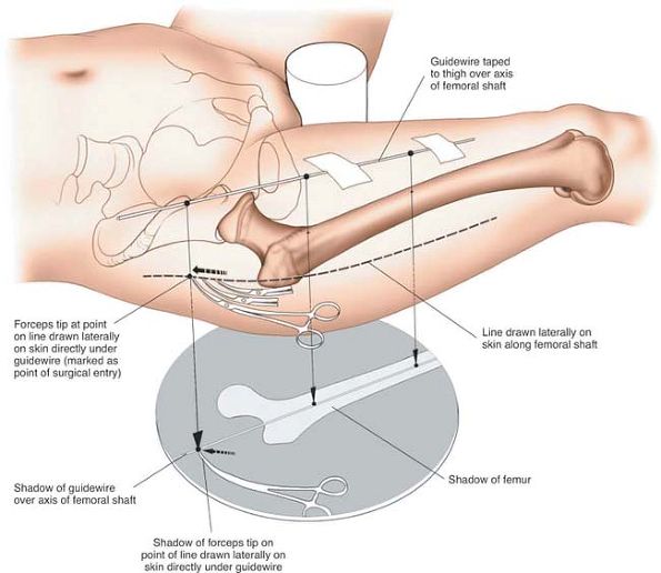 Place a long guidewire on the anterior surface of the thigh and position it under image intensifier control so that its image overlies the center of the medullary canal of the femur. Take a long artery forceps and move it proximally along the drawn line on the lateral aspect of the thigh. When the image of the forceps coincides with the image of the guidewire radiographically, mark the skin. |