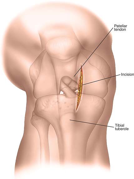 Make a 3-cm longitudinal incision approximately 1 cm from the medial border of the patella, beginning about 2 cm proximal to the distal pole of the patella. |