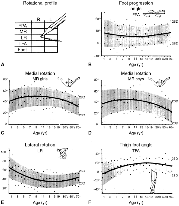 The foot-progression angle (FPA) is estimated by observing the child’s gait. It is defined as the angular difference between the axis of the foot and the line of progression. This child’s FPA is 0 degrees. B: The thigh-foot angle (TFA) is the angular difference between the axis of the foot and thigh as viewed from above. The TFA in this child is 18 degrees. From this view the shape of the foot is apparent. C: Medial hip rotation is the maximum angular difference between the vertical and the axis of the tibia. In these hips, this measurement is 70 degrees. D: Lateral hip rotation is the corresponding measurement. On this child, the angle is 10 degrees. |