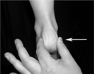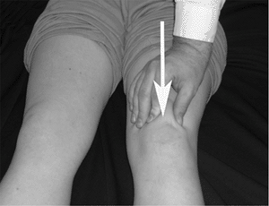 The apprehension test of the left shoulder is performed with the shoulder abducted to 90 degrees and externally rotated by the clinician’s left hand. The clinician gently pushes the humeral head forward with the right thumb (arrow), while the fingers are strategically placed anteriorly in front of the humeral head, to prevent any sudden instability. Apprehension with this maneuver indicates anterior instability of the shoulder. |