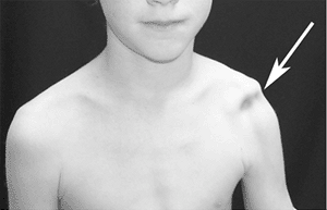 Ligamentous laxity of the shoulder can also be evaluated by applying a longitudinal inferior traction force to the upper extremity while observing the distance between the humeral head and the acromion (arrow). Excessive laxity of the superior glenohumeral ligament will allow the humeral head to subluxate inferiorly; this is a sulcus sign. |