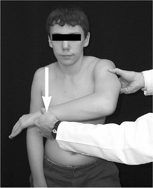 The Hawkins test is performed with the shoulder flexed forward to 90 degrees. If internal rotation in this position causes discomfort, it indicates impingement between the inflamed supraspinatus tendon and the anterior inferior acromion and the coracoacromial ligament (arrow). |