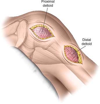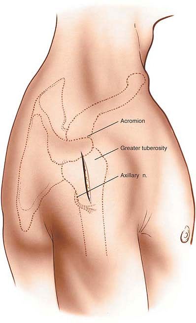 surface of the deltoid muscle, about 7 cm below the tip of the acromion (see Figs. 1-26, 1-36, 1-47, and 1-66).