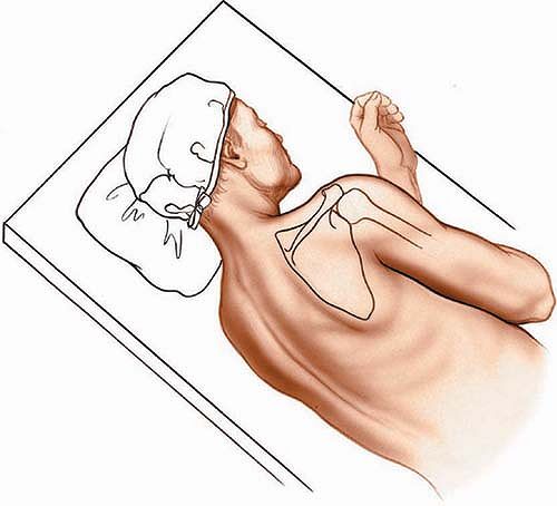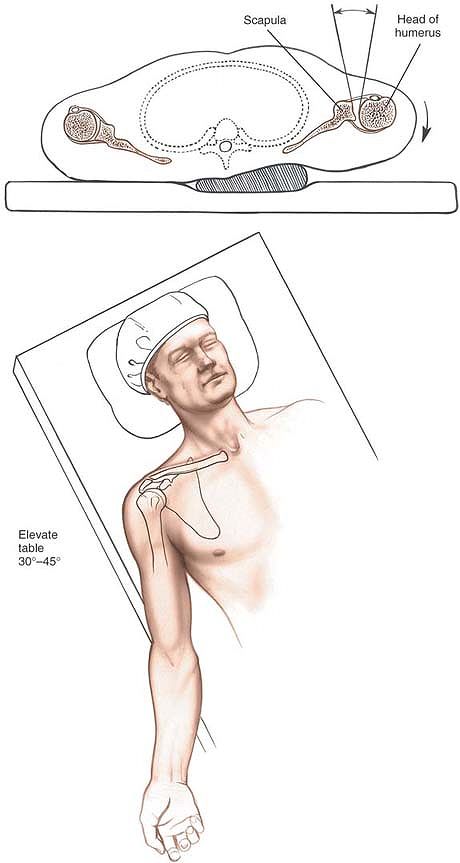 Position of the patient for the anterior approach to the shoulder. Elevate the table to 45°. A sandbag placed under the spine at the medial end of the scapula will allow the shoulder to rotate externally and open the anterior part of the joint. |