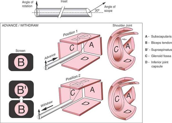 Figure 1-80 (A) Lateral views of the shoulder joint with the scope in place (right), correlated with their respective arthroscopic views (left).