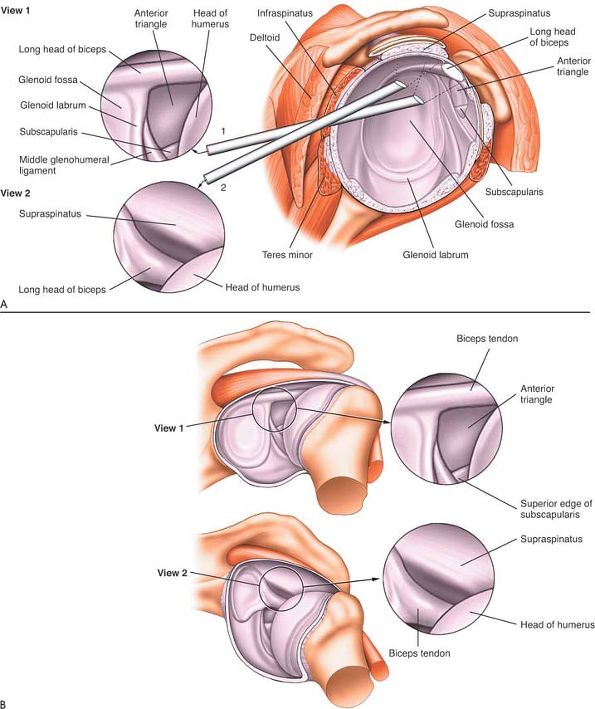 Next, rotate the arthroscope superiorly to allow visualization of the supraspinatus (Fig. 1-78A,B, View 2). The supraspinatus lies posterior to the biceps tendon.