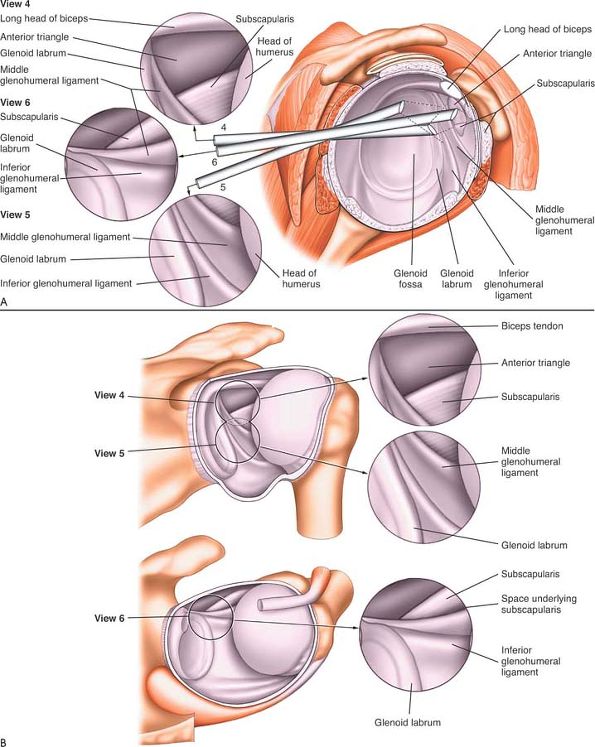 the arthroscope inferiorly and then rotate it to look posteriorly. (B) Overall views of the shoulder joint seen from the direction of the scope in Views 4, 5, and 6 (left), correlated with their respective arthroscopic views (right). -