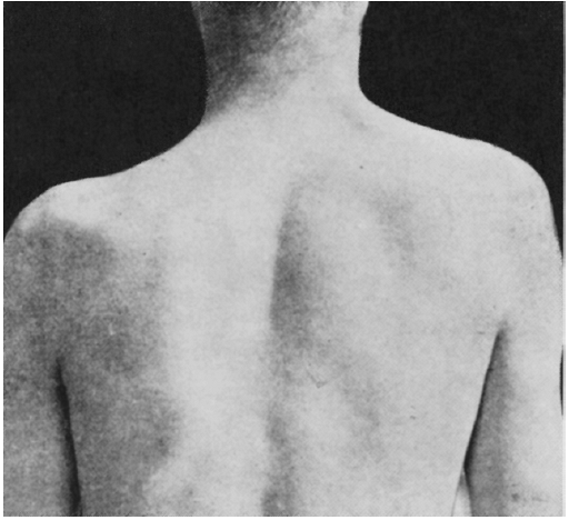 • Paralysis of the left trapezius muscle. There is a depression in the shoulder contour with downward and lateral displacement of the scapula. |