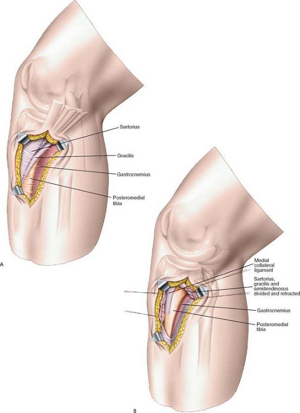 the incision down to just above the tibial tubercle (Fig. 11-38). This incision should overlie the medial border of the patellar tendon.