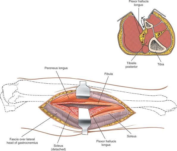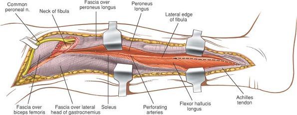 from the lateral aspect of the tibia, allows access to the tibial shaft