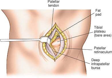 Figure 11-40 Incise the fascia on the medial edge of the patella tendon and retract the tendon laterally.