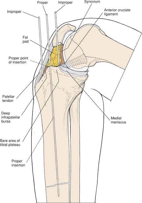 Correct and incorrect insertion points. Note that if the entry point is too far posterior then damage to the insertion of the anterior cruciate ligament on the tibia will occur. An entry point that is too far anterior will cause splintering of the anterior cortex of the tibia on nail insertion. |