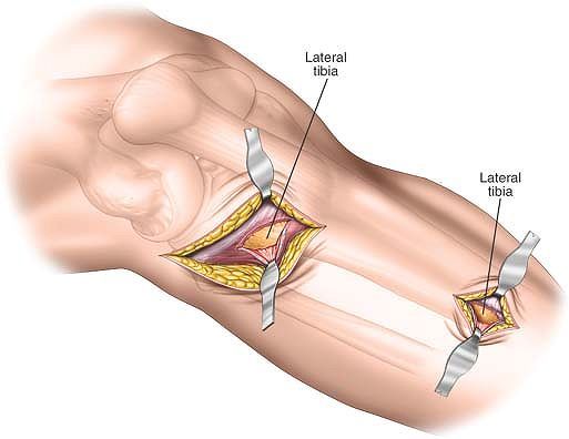 Make an S-shaped incision. Start approximately 3 to 5 cm proximal to the joint line, staying just lateral to the border of the patella tendon. Curve the incision anteriorly over Gerdy’s tubercle and extend it distally, staying about 1 cm lateral to the anterior border of the tibia. |
