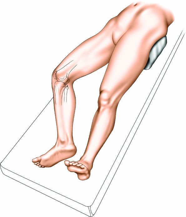 Free leg position. Place the patient supine on the operating table. Remove the end of the table. Allow the injured knee to flex over the end of the table. Place the contralateral leg in a support with the hip flexed and abducted and the knee flexed. |