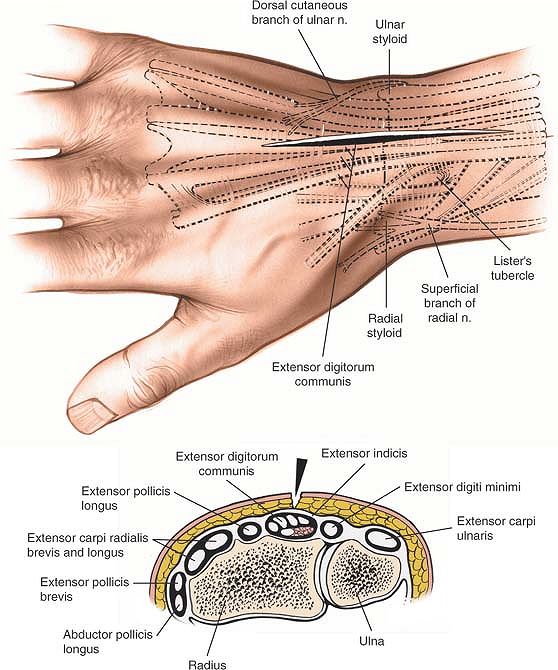 Skin flaps are developed, and the extensor retinaculum is visualized in the deeper portion of the wound. Cross section reveals the approach to the fourth tunnel, which contains the extensor digitorum communis and the extensor indicis proprius. |