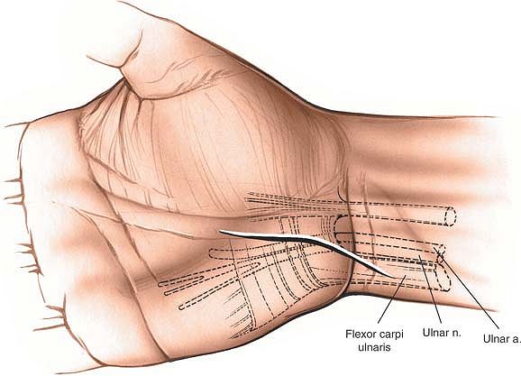 hand superficial to the flexor retinaculum within the canal of Guyon.