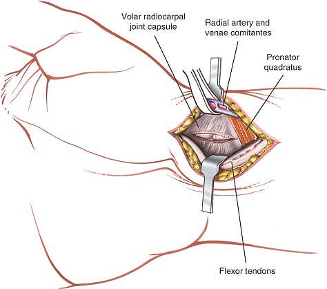 Figure 5-7 The extensor tendons in their compartments have been elevated to expose the distal end of the radius and ulna.