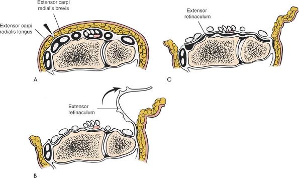 Open each of the compartments sequentially from radius to ulna by incising the septum that connects the retinaculum to the carpus itself and the joint capsule. (C) Now that the compartments have been deroofed, place the retinaculum between the extensor tendons and the distal ends of the radius and ulna to provide added protection for the tendons. |