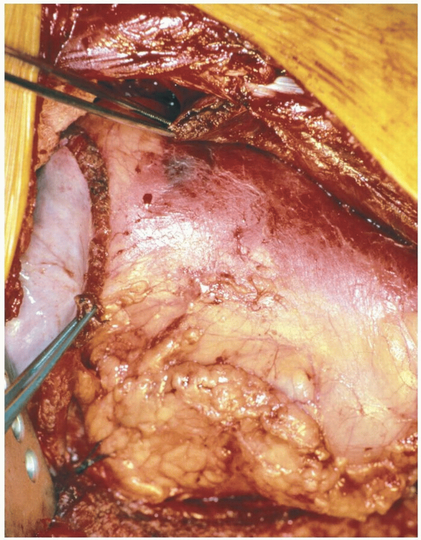 An incision over the fourth rib is conducted while protecting the intercostal neurovascular structures anteriorly and cephalad (Fig. 13-3).