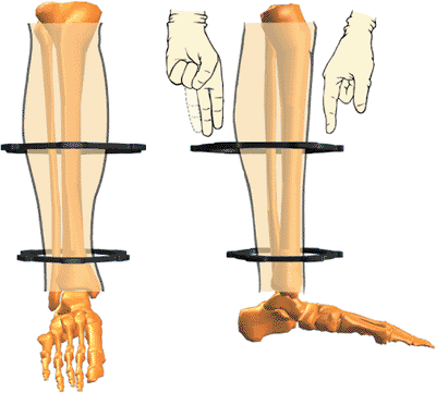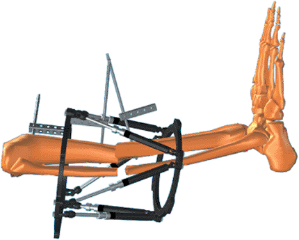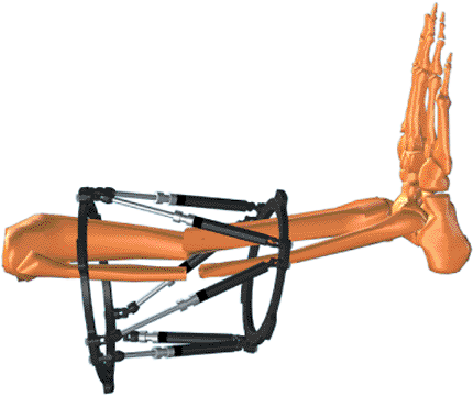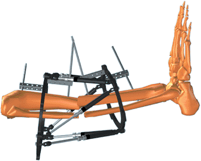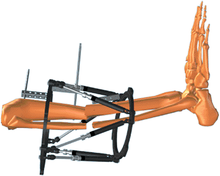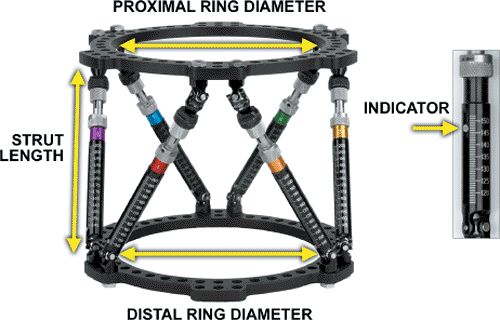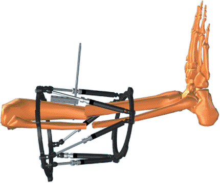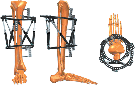 One Spatial Frame ring can be repositioned with respect to the other by adjusting strut lengths. (Copyright © J. Charles Taylor.) |