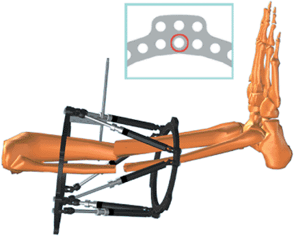 Additional skeletal stability and prevention of equinus deformity may be gained by fixing the foot to a foot plate or U plate. (Copyright © J. Charles Taylor.) |