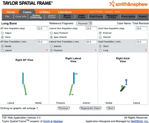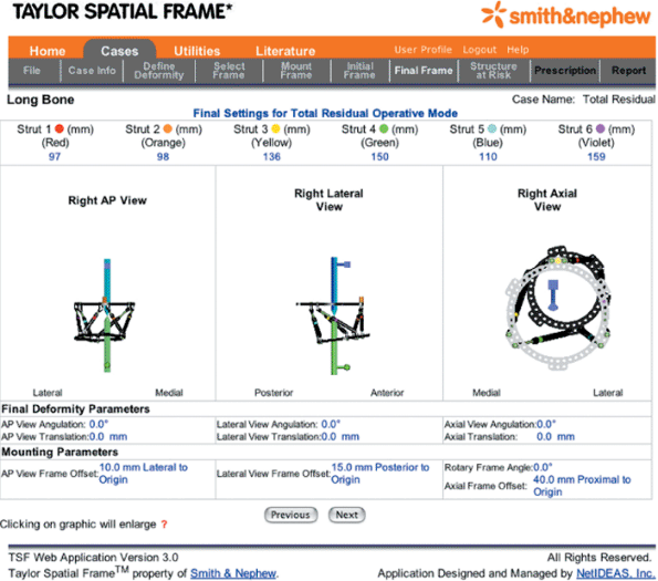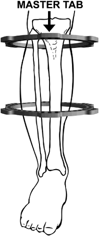 Each numbered and colored clip is applied to a strut beginning with strut no. 1 (which is attached anteriorly to the designated master tab) and progressing counterclockwise as viewed from the proximal end of the frame. The computer program assumes the universal joints connecting strut no. 1 and no. 2 to the proximal ring are aligned directly anterior with respect to the reference fragment. Different rotational alignments, especially for more proximal femoral and humeral applications, can be accommodated by changing rotary frame offset. (Copyright © J. Charles Taylor.) |