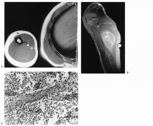 Axial T1-weighted magnetic resonance image through the humerus shows a slightly hyperintense mass replacing the triceps muscles of the arm. The neurovascular bundle (arrowheads) is contiguous with the anterior medial edge of the mass. (B) After contrast administration, there is heterogeneous enhancement of the mass. (C) Photomicrograph of the lesion demonstrates undifferentiated small blue cells lining fibrovascular septae with central discohesion, imparting an alveolar appearance. |