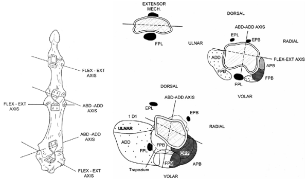 of the joints and with abduction–adduction at the CMC and MCP joints.