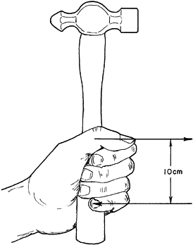 A normal hand may be about 10 cm wide where it holds a hammer. In the force stroke, the thumb web pushes while the little and ring fingers pull. In retracting the hammer, the hypothenar mass pushes, and the index and middle fingers pull. |