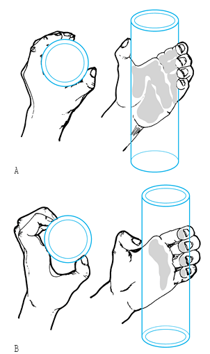 In high ulnar palsy, the little and ring fingers may be so weak that only the middle finger can pull firmly enough to complete the couple. This is only half as wide as in a normal hand. The hammer is unstable and its action is weak. For many tasks involving torque, it is better to have strong index and little fingers, even if the middle finger is weak. |