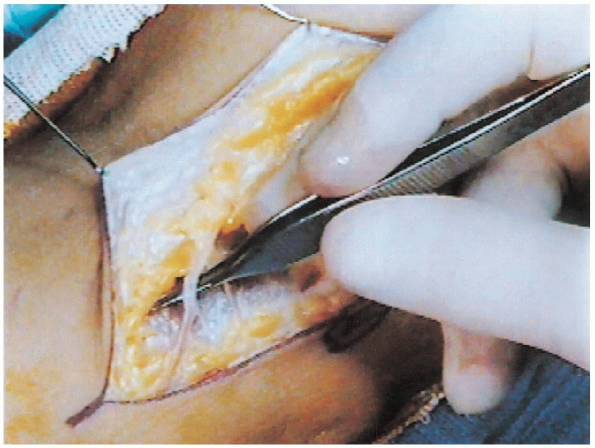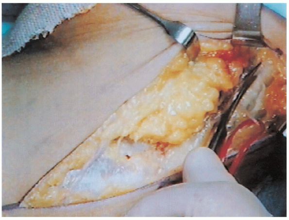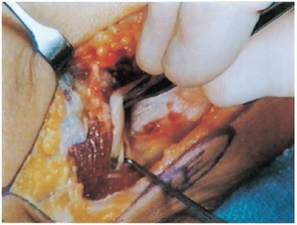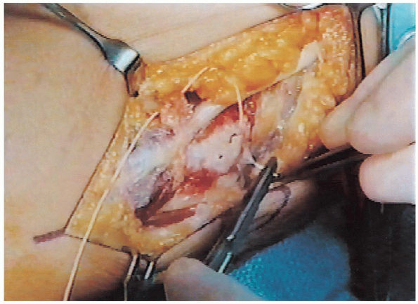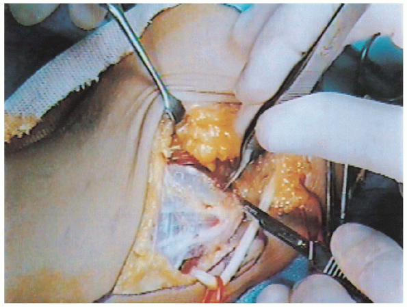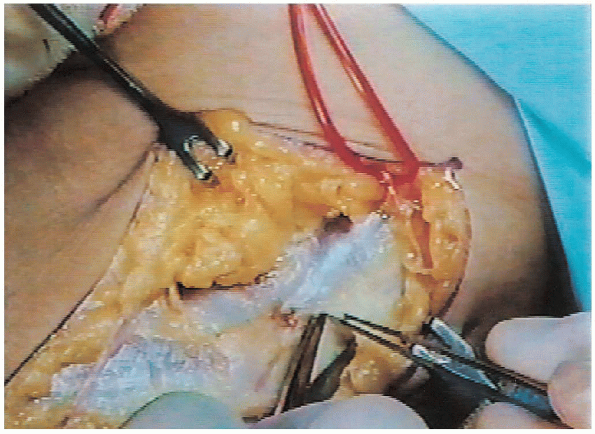 retracted, and with blunt scissors the arcade of Struthers is released (Fig. 9-10). If the arcade is not fully released, it may cause an iatrogenic compression of the ulnar nerve