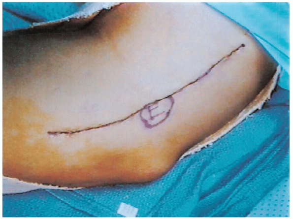 FIGURE 9-3. Incision marked. E, medial epicondyle.